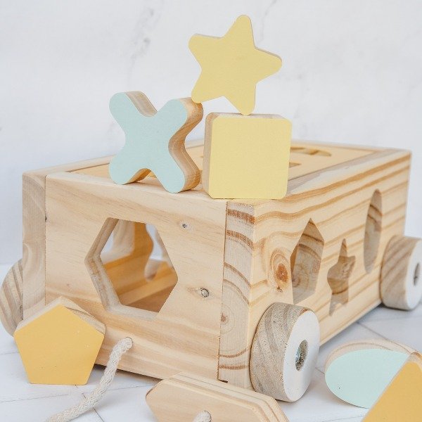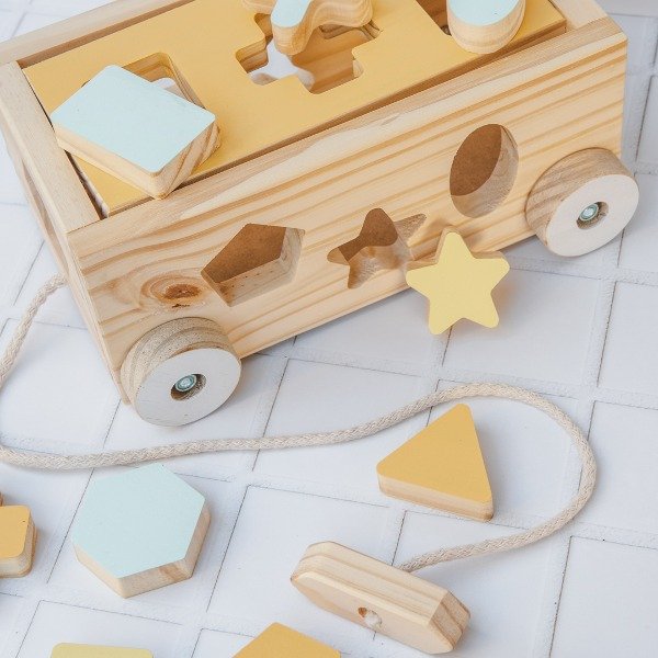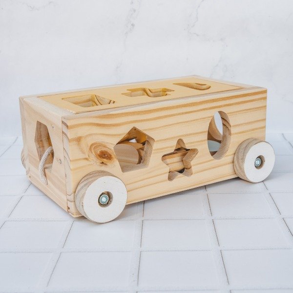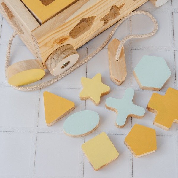 Carro de arrastre con figuras encastrables. En cada cara del carro tiene formas encastrables.