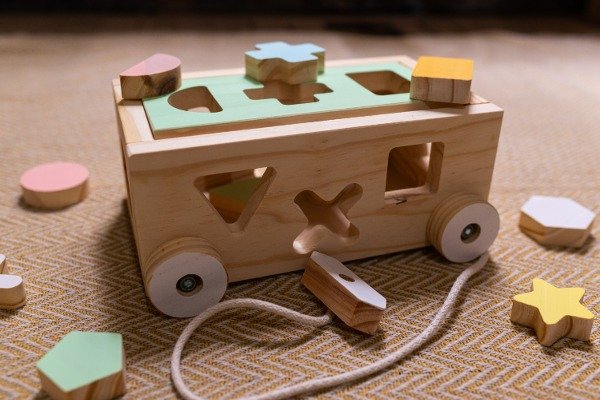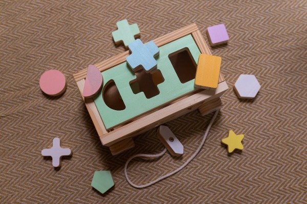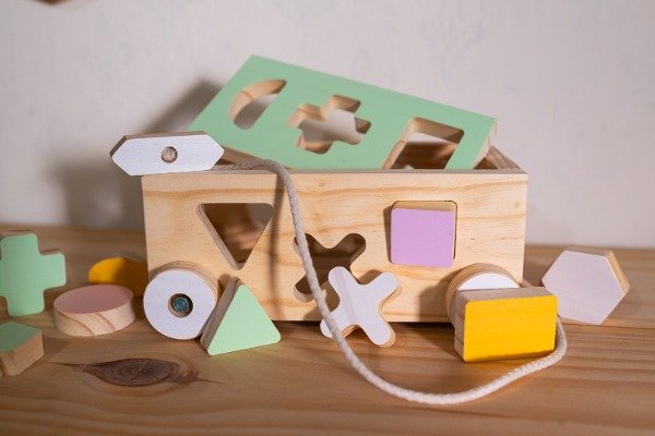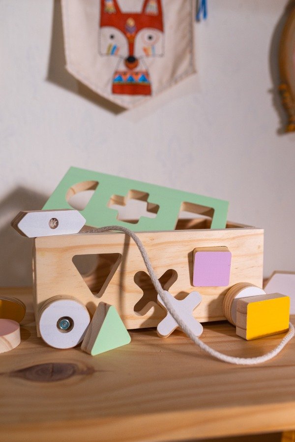 Carro de arrastre con figuras encastrables. En cada cara del carro tiene formas encastrables.
