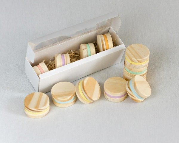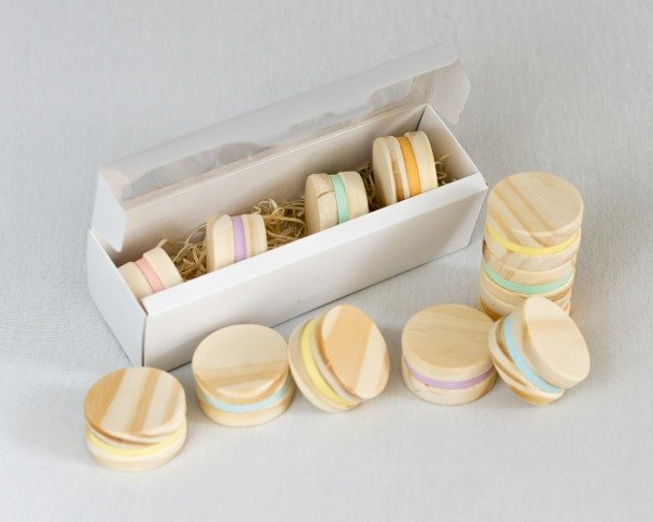 Realizado en madera de pino y mdf, cada alfajor mide 4.5cm de diámetro.