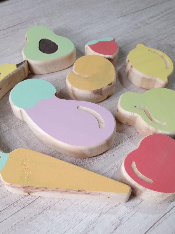 Set de frutas y verduras en madera, realizados integramente en pino.